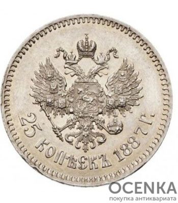 Хотите выгодно продать 25 копеек 1887 года Александр 3 ? Воспользуйтесь услугами нашего сайта, средняя цена товара по Украине oт 5000 грн. дo 30000 грн. Мы специализируемся на оценке антикварных, старинных, памятных раритетных предметов, знаем точную цену таким сокровищам.