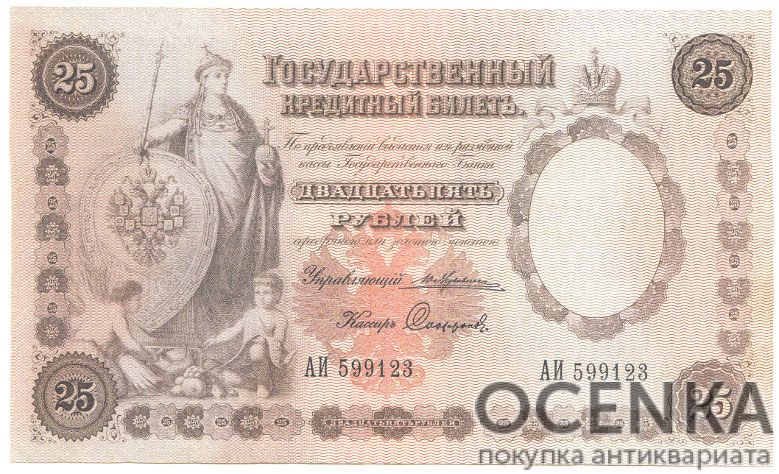 Хотите выгодно продать Банкнота (Билет) 25 рублей 1892 год ? Воспользуйтесь услугами нашего сайта, средняя цена товара по Украине oт 92000 грн. дo 270000 грн. Мы специализируемся на оценке антикварных, старинных, памятных раритетных предметов, знаем точную цену таким сокровищам.