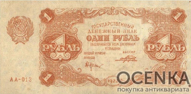 Хотите выгодно продать Банкнота РСФСР 1 рубль 1922 года ? Воспользуйтесь услугами нашего сайта, средняя цена товара по Украине oт 20 грн. дo 500 грн. Мы специализируемся на оценке антикварных, старинных, памятных раритетных предметов, знаем точную цену таким сокровищам.