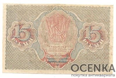 Хотите выгодно продать Банкнота РСФСР 15 рублей 1919 года ? Воспользуйтесь услугами нашего сайта, средняя цена товара по Украине oт 10 грн. дo 150 грн. Мы специализируемся на оценке антикварных, старинных, памятных раритетных предметов, знаем точную цену таким сокровищам.