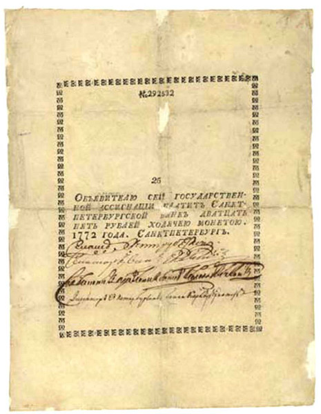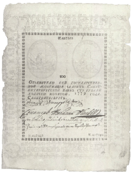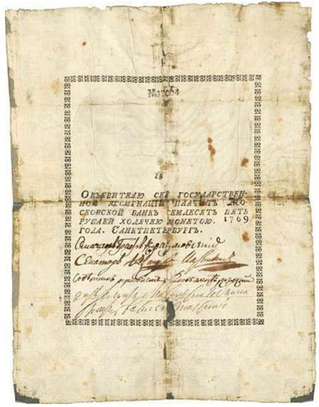 Государственные ассигнации в Царской России появились в 1769 году. До этого любой житель империи не представлял себе, как можно рассчитаться другими денежными средствами, окромя серебряной или золотой монеты. Но время диктовало свои правила. Шла «очередная» русско-турецкая война и бюджет страны находился в очень плачевном состоянии. К тому же добыча серебра для выпуска серебряного рубля — основного эквивалента в денежном обращении — была недостаточная для удовлетворения внутренних «потребностей», а также ведения войны.