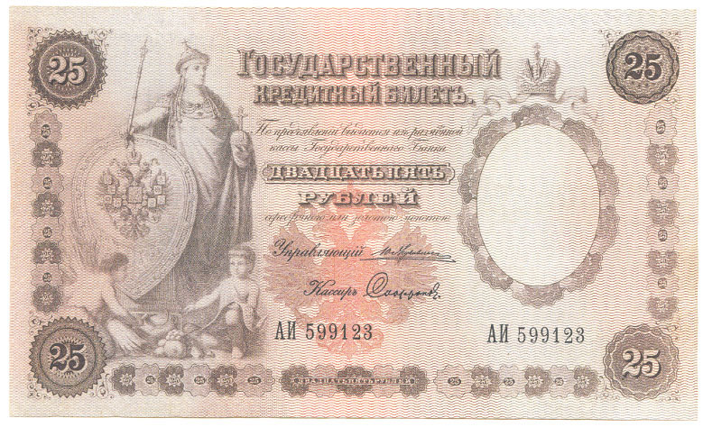 Так как деньги 1887 г. отличаются простотой дизайна, 25 рублей были заменены на новые в 1892 г. Старые кредитные билеты обменивались. Вот почему так сложно встретить в продаже 25-рублевые банкноты 1887 года. Их стоимость сегодня чрезвычайно велика. Остановимся более подробно на вопросе цены.