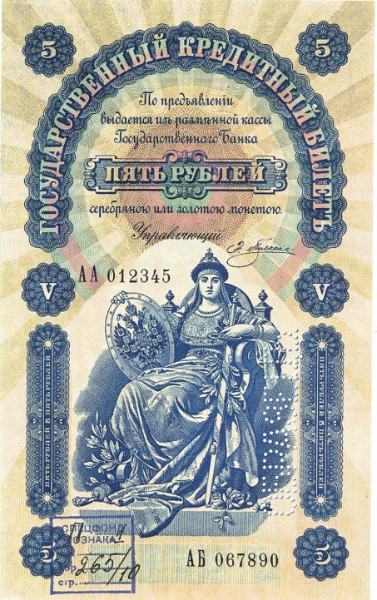 - традиционную надпись: «Государственный кредитный билет. По предъявлении выдается из разменной кассы Государственного Банка (номинал) РУБЛЬ серебряною или золотою монетою»;