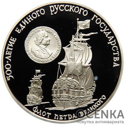 Серебряная монета 3 рубля 1990 года. Флот Петра Великого
