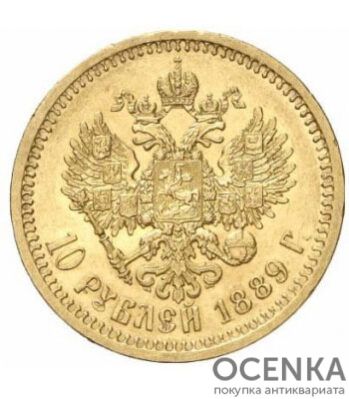 На реверсі, по центру, зображено двоголового орла. У своїх лапах він тримає скіпетр та державу. На головах – імператорські корони, одна центральна – по центру. На грудях — московський герб, символи інших 8 князівств та царств зафіксовані на крилах орла. Внизу вказано номінал монети – 10 рублів 1889 р. Коло описує декоративна облямівка.