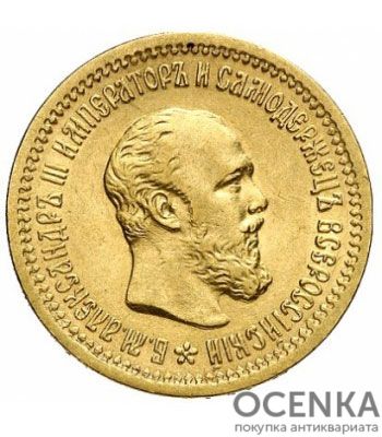 Золота монета має загальну вагу 6,45 г. У ній – 5,8 г дорогоцінного металу. Діаметр – 21,3 мм. Гурт — із написом. Монета була викарбувана способом анциркулейтед. Центральну частину аверсу займає портрет імператора. Він зображений у профіль. Навколо нього круговий напис: «Б. М. Олександр III Імператор та самодержець Всеросійський». Уздовж усього кола – декоративна облямівка. На звороті вигравіруваний двоголовий орел, який тримає скіпетр і державу в лапах. На головах – імператорські корони (всього 3 штуки: дві – маленькі, одна – центральна, більше). На грудях та крилах — герби князівств та царств. Внизу вказана номінальна вартість – 5 рублів 1889 р. По всьому колу тягнеться зубчастий обідок. Якщо вам потрібно продати антикваріат, пам'ятні монети, грошові знаки різних часів та народів, звертайтесь до фахівців компанії «Оцінка». Ми пропонуємо найкращі умови співпраці. Якісна та швидка експертиза, миттєва скуповування, до 90% від ринкової ціни, гарантія конфіденційності — всі умови для комфортної, безпечної, вигідної для вас угоди передбачені.