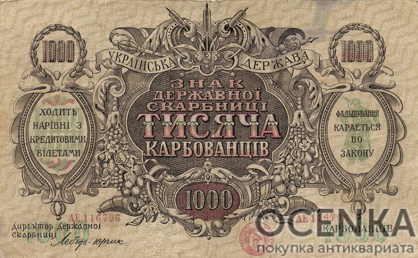 Бажаєте вигідно продати Банкнота 1000 карбованців 1918 року ? Скористайтеся послугами нашого сайту, середня ціна товару по Україні від 50 грн. дo 1200 грн. Ми спеціалізуємось на оцінці антикварних, старовинних, пам'ятних, раритетних предметів, знаємо точну ціну таким скарбам.