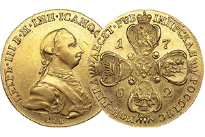 У нумізматичних каталогах можна знайти 3 номіналу монет із золота, випущених Петром Третім. Період – з 1761 до 1762 року. Відразу варто відзначити, що ціни золотих монет Петра 3 високі ще й тому, що вони карбувалися невеликими тиражами. Так, відомі такі номінали монет Петра 3: