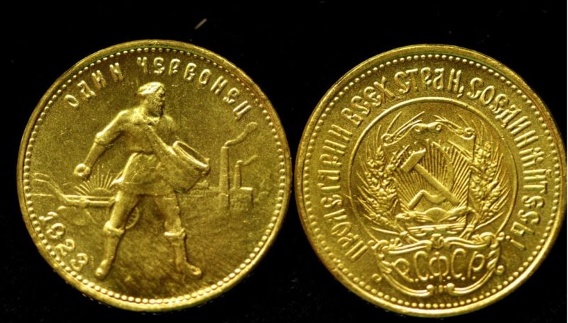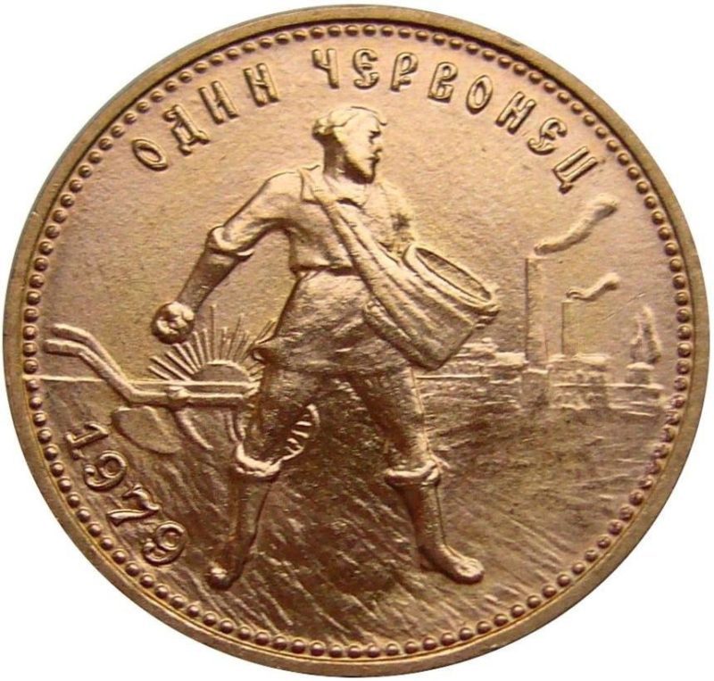 Під час випуску першого золотого червінця, який у народі охрестили «Сіячем», були використані технології царського карбування. А ось дизайн 1923 повністю відбивав «дух» епохи. На аверсі було вміщено герб РСФСР. Серп і молот зображені на тлі сонячних променів та оточені вінком. По всьому колу – декоративний кант, а нижче найпопулярніший соціалістичний девіз: «Пролетарі всіх країн…». На реверсі красується справжній радянський трудівник – сіяч зерна. На задньому плані зображено плуг, заводи та сонце – «непорушні атрибути» свідомого комуніста, що свято вірить у світле майбутнє та ідеї товаришів Маркса та Енгельса. Золоті червонці СРСР сьогодні є одними з найпопулярніших монет тієї доби.