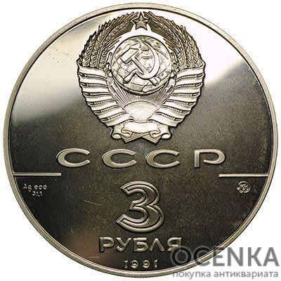 Срібна монета 3 рублі 1991 року. Тріумфальна арка. Москва