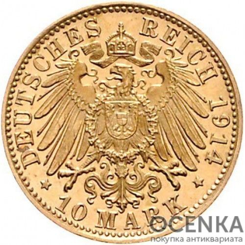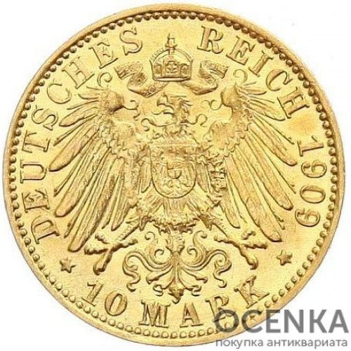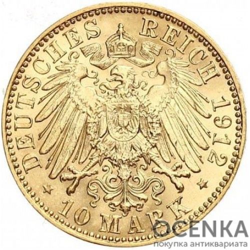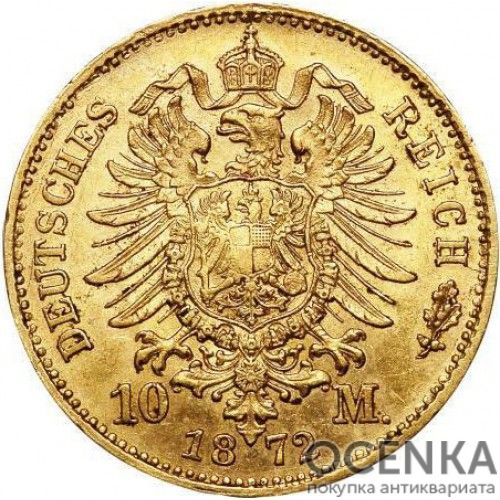 10 марок карбувалися з 1872 по 1914 роки. Загальний тираж становив понад 74 млн екземплярів. Підписаний закон передбачав як єдині технічні характеристики монет, а й їх дизайн. Було вирішено об'єднати німецькі землі, у тому числі і єдиним оформленням марок, зокрема, реверс усіх монет Німеччини мав утримувати герб імперії, номінальну вартість та рік карбування. А ось на аверс поміщався портрет місцевого правителя, чи то король, герцог, священнослужитель чи князь. Тут також знаходився титульний напис та знак монетного двору, що займається карбуванням. На тих територіях, де не було монархії, вирішили зображати герб міста або округу. На аверсах 10 золотих марок Німеччини можна побачити портрети: