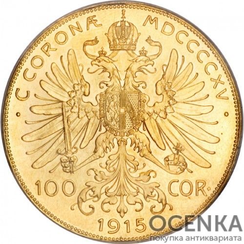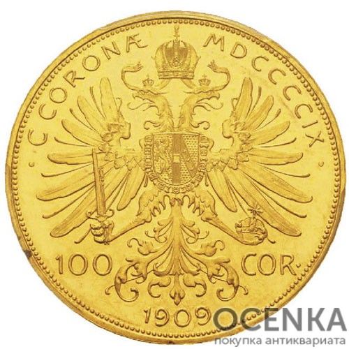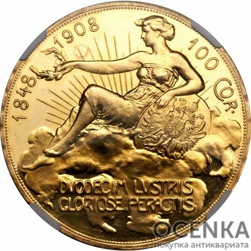 Австро-угорська монета із золота номіналом 100 крон має кілька типів. До першого належить пам'ятний грошовий знак 1908 р., випущений у Відні тиражем 16 тис. екз. до 60-річчя правління імператора Франца-Йосифа I. Аверс містить звернений вправо профіль «винуватця урочистості» в обрамленні напису з його титулом, а реверс – алегорію Австрії в особі молодої жінки, що сидить на хмарі в променях сонця, яка спирається лівою рукою на з державним гербом, а у правій простягає у простір вінок. У верхній частині поля знаходяться дати (1848–1908) та позначення номінальної вартості грошової знаки, а в нижній – латинський дворядковий напис: «DVODECIM LVSTRIS GLORIOSE PERACTIS». Група містить легенду: «VNITIS VIRIBVS». Автор дизайну – художник Рудольф Маршалл. Другий тип – це пам'ятний грошовий знак, випущений у Кремниці у 1907 р. до сорокаріччя коронації Франца-Йосифа як глави двоєдиної монархії. На його лицьовій стороні знаходяться ті самі зображення, що і на аверсі золотої монети першого типу, а на реверсі можна побачити: