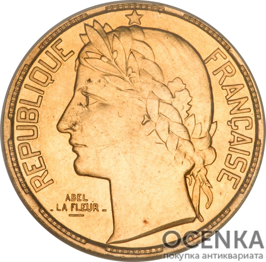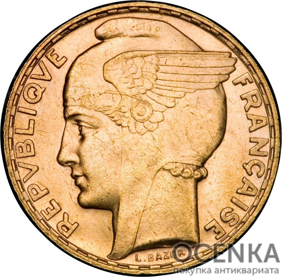 Наконец, последний тип золотой монеты номиналом 100 франков, автором которого стал Габриель Бернар Люсьен Базор, выглядит следующим образом. Аверс содержит обращенный влево профиль Марianne, молодой женщины, традиционно олицетворяющей Францию, обрамленный с двух сторон надписью: «REPVBLIQVE FRANCAISE». Здесь же указано имя медальера. На реверсе находятся: