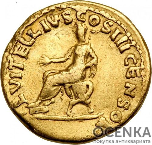 На лицевой стороне золотого ауреуса расположено изображение в профиль Авла Вителия Германика Августа. Правитель смотрит вправо. Вокруг него – штемпель «AVITELLIVSGERMIMPAVGTRI». На реверсе – богиня согласия Конкордия. Ее окружает надпись: «LVITELLIVS COSII CENSOR».