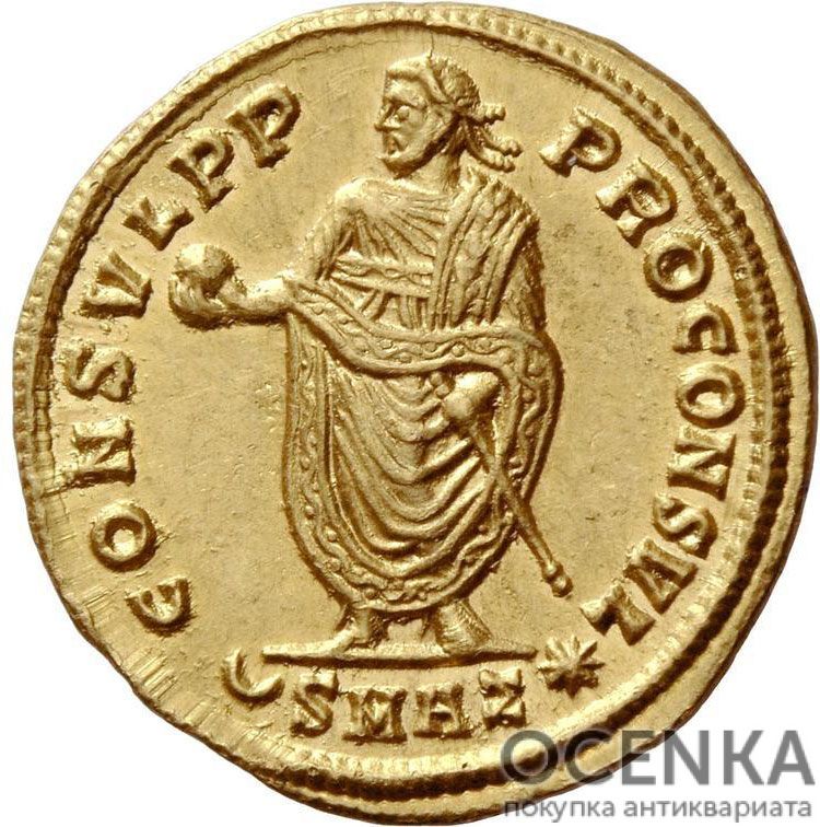 Золотой ауреус Цезаря Гая Валерия Галерия Максимина 2 Августа, римского императора, трижды занимавшего должность Консула, содержит изображение его бюста в профиль с лавровым венком на голове. На реверсе отчеканена фигура принца, облаченного в консульскую мантию, с глобусом в правой руке и скипетром – в левой.
