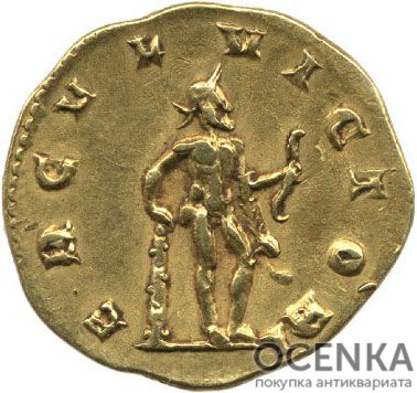Золотой ауреус, чеканка которого выполнялась в 253 году нашей эры во времена правления римского императора Цезаря Марка Эмилия Эмилиана Августа. Как и большинству монет того времени, этому дензнаку присуща неправильная округлая форма, что связано с особенностями ковки тех времен.