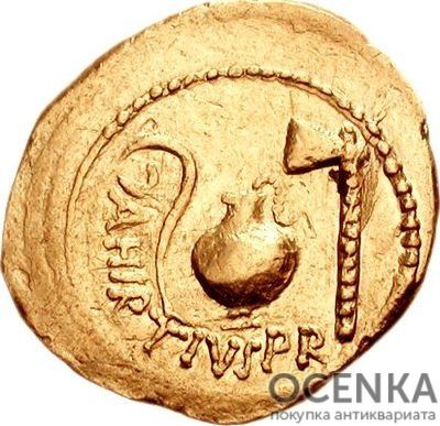 Поздний ауреус до 45 года до н. э. отличается более лаконичным, но от этого не менее значимым дизайном. В тот период Рим уже полностью находился под властью Цезаря.