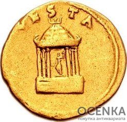На лицевой стороне (аверсе) золотого ауреуса, отчеканенного в 54–68 годах в честь Луция Домиция Агенобарба, изображен профиль политика с непокрытой головой. Его взгляд направлен вправо. Слева от него расположена надпись: «NERO O CAESAR», а справа – «AVGV STVS». Оба штемпеля расположены в дугообразном направлении. На верхней части реверса написано: «VESTA». Виден храм Весты – древнеримской богини семьи и жертвенного огня.