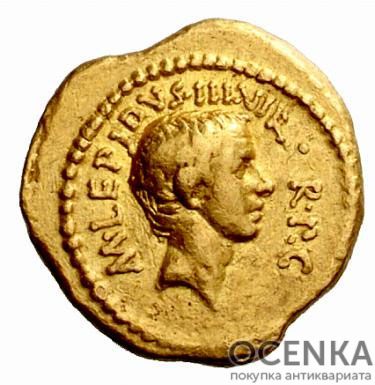 Золотая монета ауреус, Марк Эмилий Лепид, была выпущена в честь древнеримского политика. Наиболее известен как консул, участник второго триумвирата, как Верховный понтифик. Золотой ауреус Марка Эмилия Лепида попал в обращение в 43 г. до. н. э., то есть при жизни политика. Учитывая факт, что этот человек является противоречивой личностью, получившей немало критики даже от современников, в его честь монеты могли и не чеканиться. Тем не менее это произошло, что делает золотой ауреус уникальным экземпляром. Купить его готовы многие нумизматы за немалые деньги.